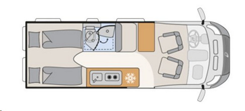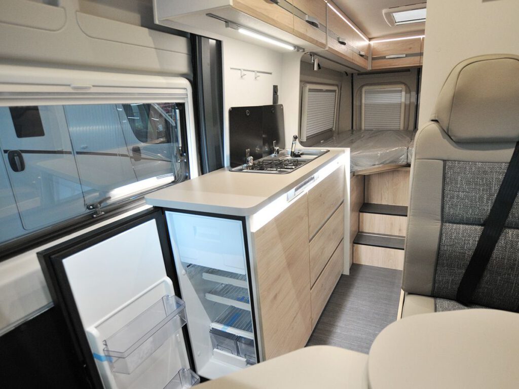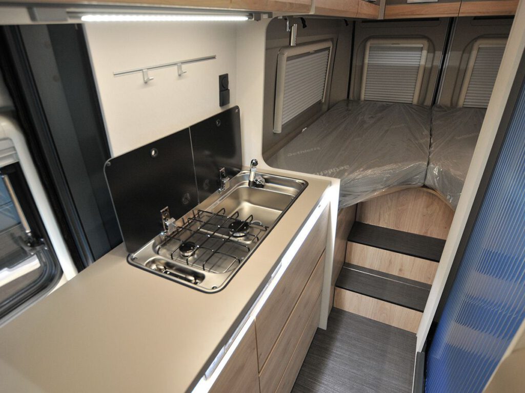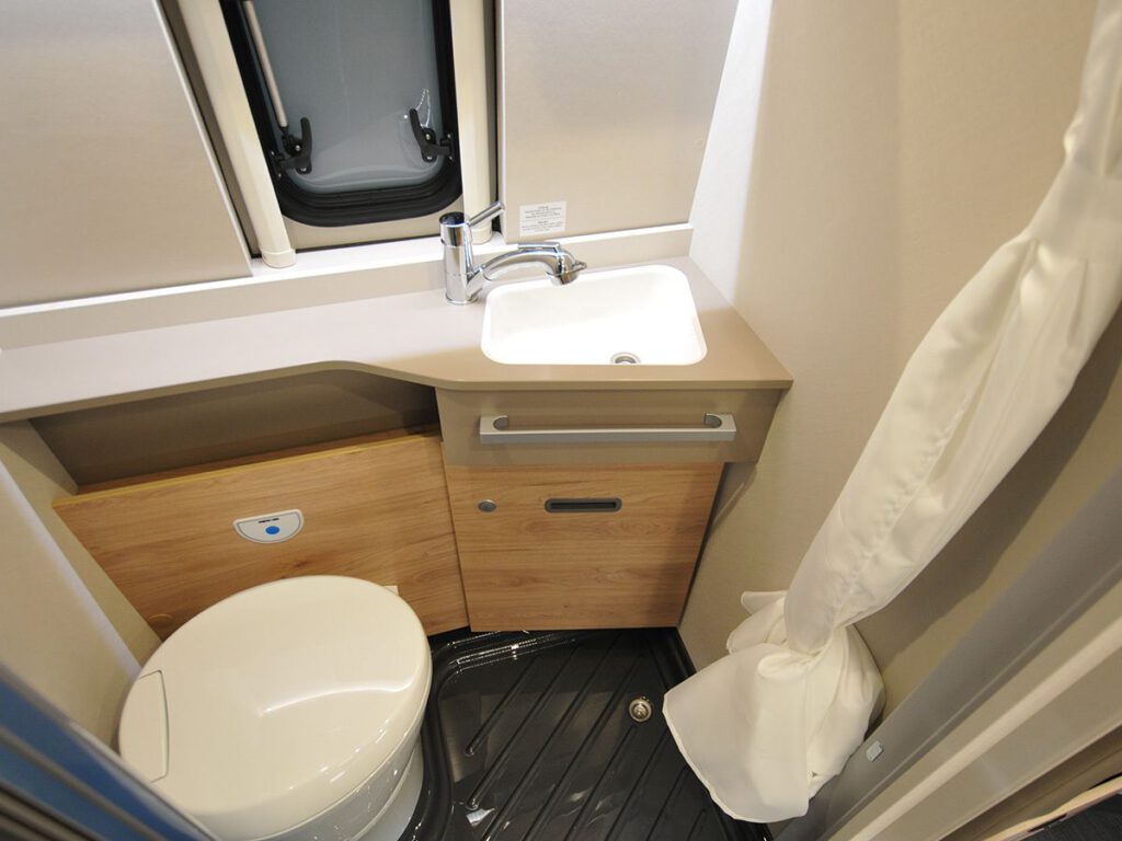 Der Sanitärbereich befindet sich mit Duschkabine, der Wasserspültoilette und dem Waschbecken im Fahrzeugmittelbereich vor dem Schlafbereich. Der Küchenarbeitsblock besteht aus einem 90 Liter Kompressorkühlschrank mit Gefrierfach. Gekocht wird auf einem Gasherd mit drei Kochstellen. Daneben ist ein Edelstahlspülbecken und eine komplette Küchenausstattung ist im Reisemobil vorhanden Die Heißwasserversorgung ist an allen Wasserhähnen durch einen Trumatik-Heißwasserboiler gewährleistet. Der Frischwassertank fasst 100 Liter. Für die Abwässer ist ein separater Abwassertank vorhanden, welcher sich kinderleicht entleeren lässt. Das gleiche gilt für die Thedford Wasserspültoilette, welche ein Fassungsvermögen von 17 Liter hat.