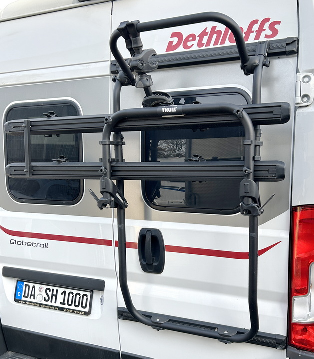 Ein Fahrradträger für zwei Fahrräder bis 35 KG und eine Sonnenmarkise sind am Fahrzeug fest montiert. Ein Campingtisch mit 2 Regiestühlen, Verlängerungs- und Adapterkabel, Wasserschlauch, Ausgleichkeile, Bordwerkzeug, ein vollwertiges Reserverad und viele praktische Dinge mehr sind im Fahrzeug vorhanden